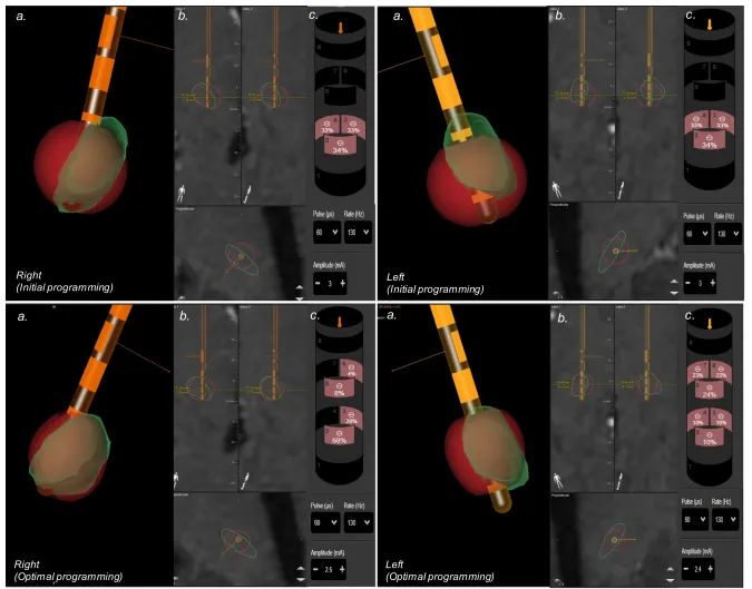 A imagem mostra o exemplo de um paciente com sintomas persistentes após a cirurgia de DBS. No painel superior, vemos a estimulação inicial: o campo elétrico (em vermelho) está fora do alvo ideal no lado esquerdo. Já no painel inferior, com a nova programação guiada por imagem, o estímulo foi redirecionado para cobrir com mais precisão a área do cérebro responsável pelos sintomas motores — a parte dorsolateral do núcleo subtalâmico (STN).